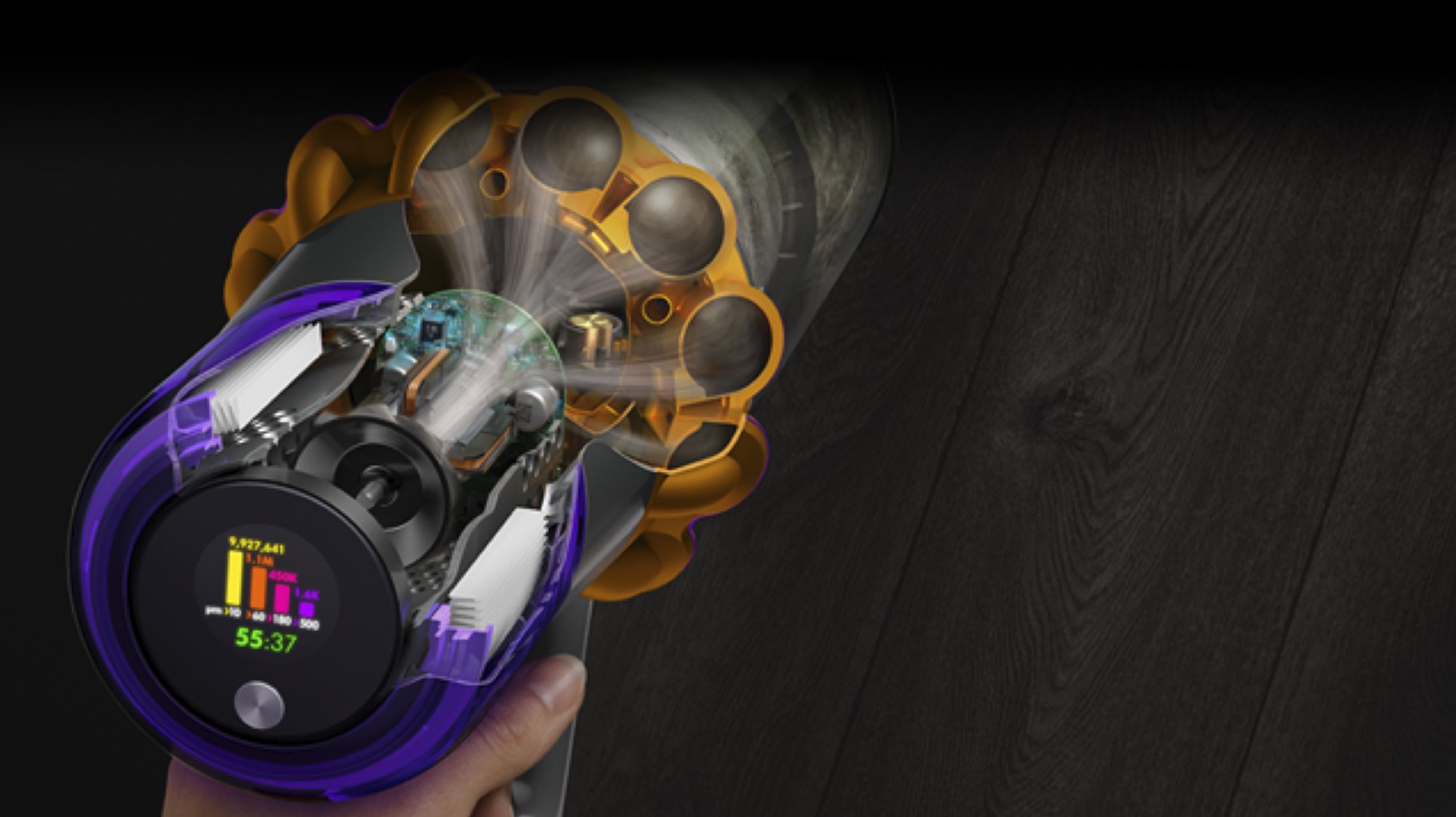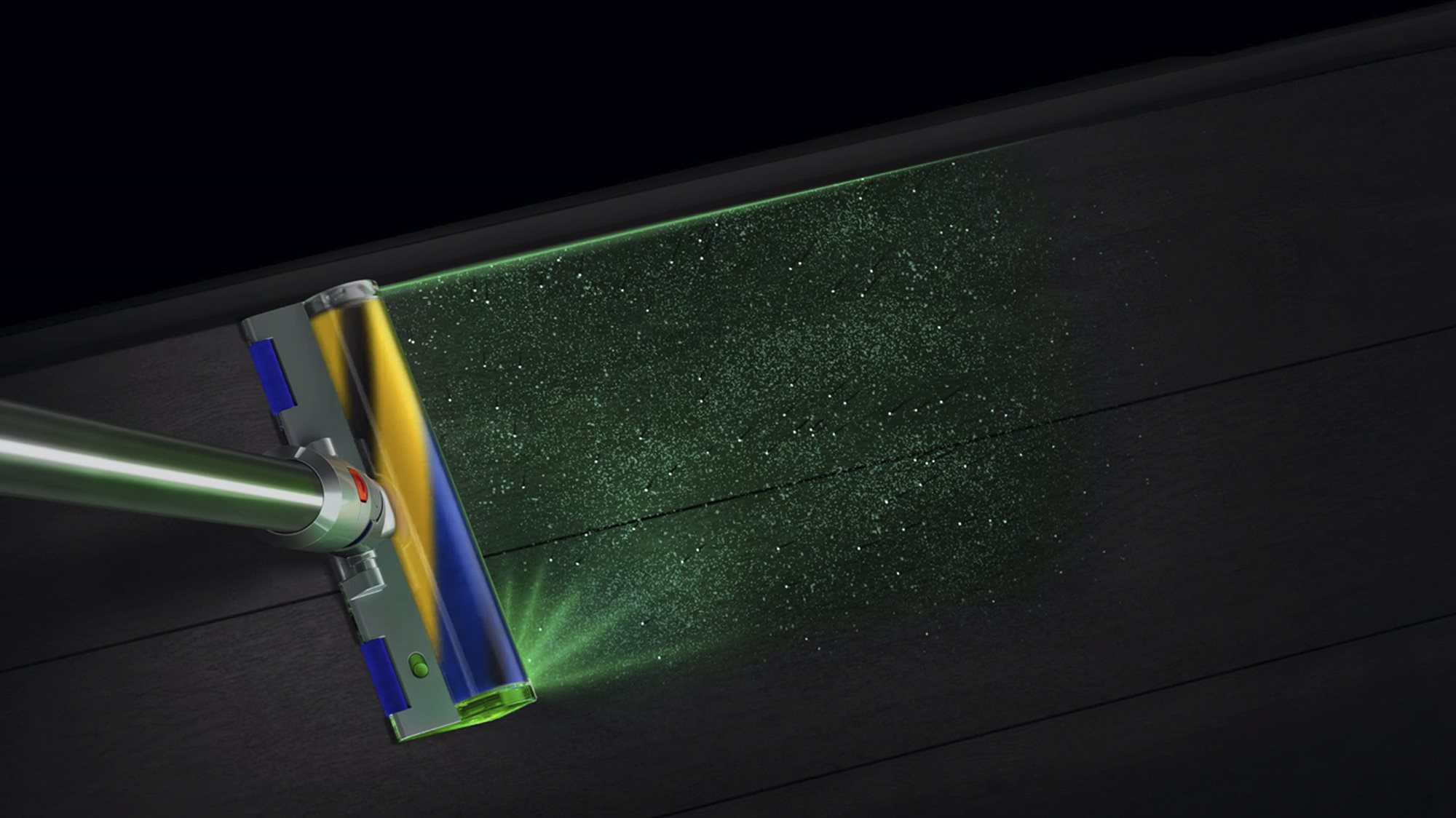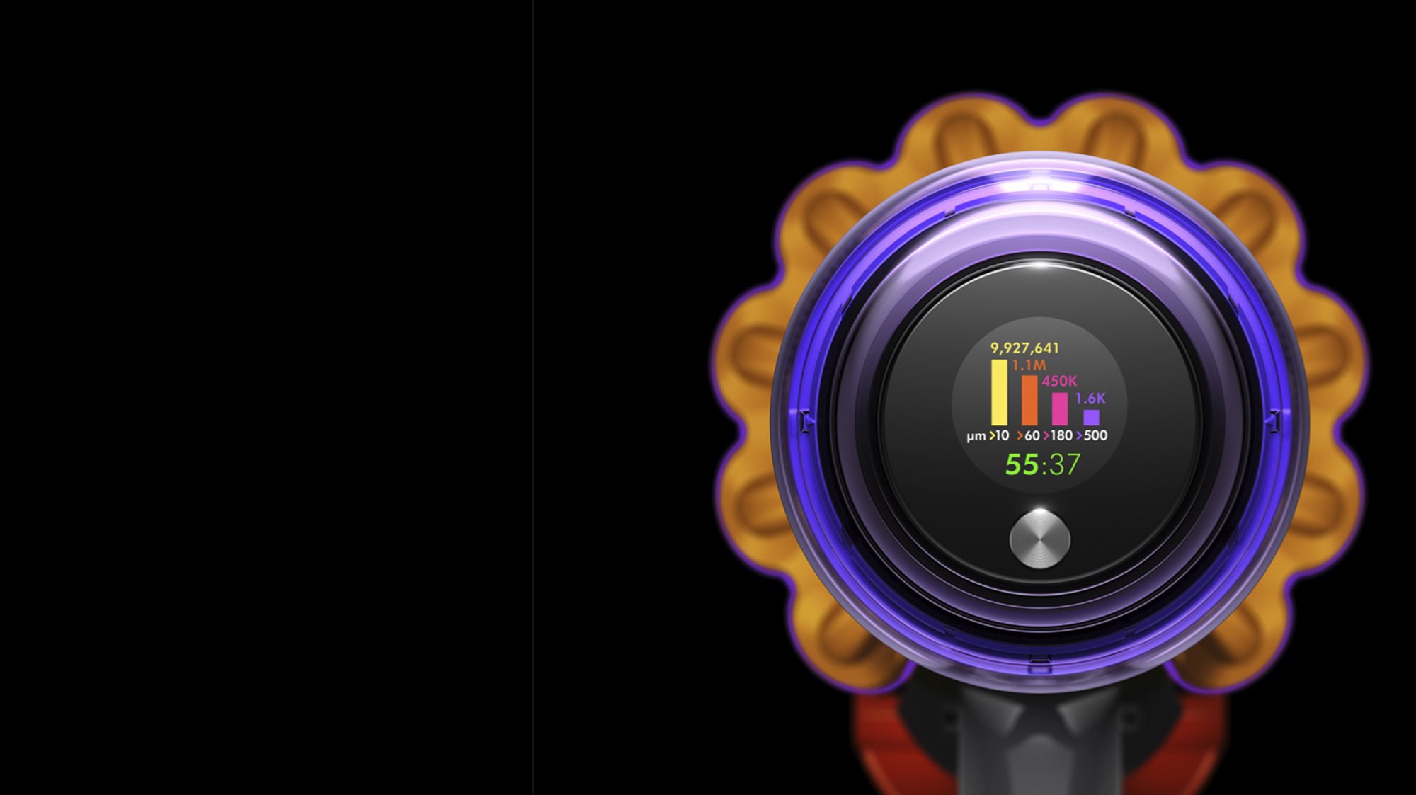 1Suction tested to EN IEC62885-4 CL5.8 and CL5.9, tested at the flexible inlet, loaded to bin full, in Boost mode against the cordless stick market. 2Best accuracy achieved in Auto mode. Auto ramp feature in Auto mode only. Testing based on average in home usage according to Dyson internal test data. Microscopic dust is defined as particles less than 100 microns. 3Applies in Eco mode on hard floor. Actual run time will vary based on power mode, floor type and/or attachments used. 4Dynamic Load Sensor technology only applies in Auto mode with the High Torque cleaner head attached. 5Filtration tested against ASTM F3150, tested in Boost mode by independent third-party, SGS-IBR Laboratories US in 2020.